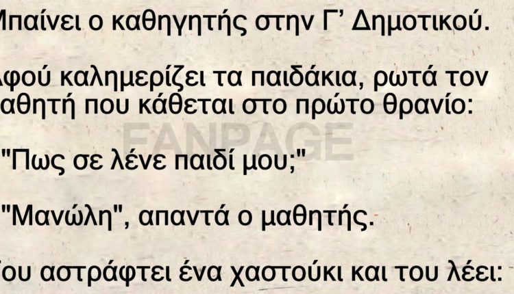 Αφού καλημερίζει τα παιδάκια, ρωτά τον μαθητή που κάθεται στο πρώτο θρανίο: