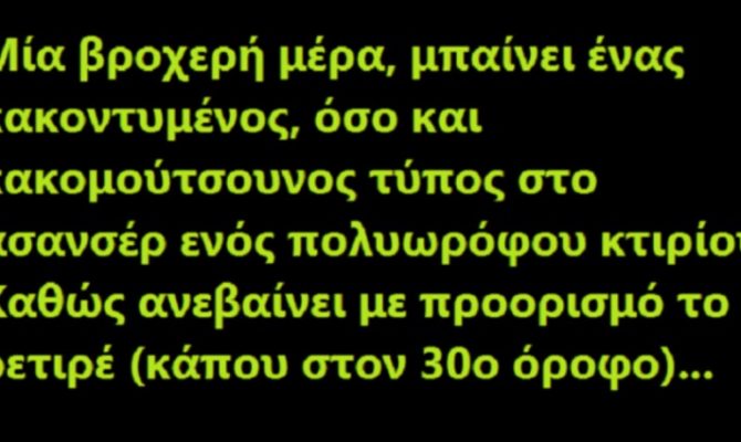 Μία βροχερή μέρα, μπαίνει ένας κακοντυμένος και κακομούτσουνος τύπος στο ασανσέρ ενός πολυωρόφου κτιρίου.