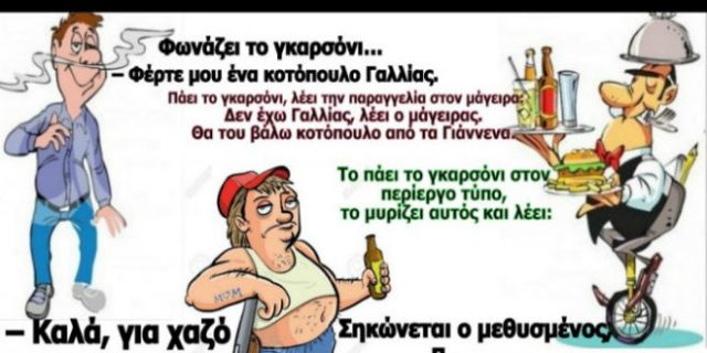 – Καλά, για χαζό με περνάτε; Εγώ ζήτησα κοτόπουλο Γαλλίας, όχι από τα Γιάννενα! Το πάει πίσω το γκαρσόνι.