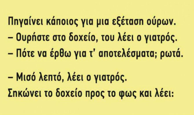 Πάει τα »ούρα» για εξέταση. Σηκώνει ο γιατρός δοχείο προς το φως και λέει: