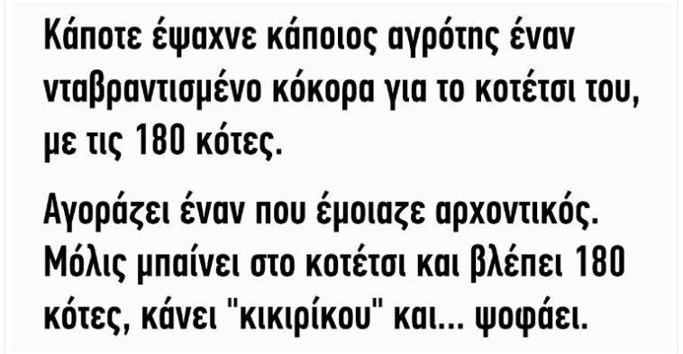 Κάποτε έψαχνε κάποιος αγρότης έναν νταβραντισμένο κόκορα για το κοτέτσι. Αγοράζει έναν που έμοιαζε αρχοντικός. Μόλις μπαίνει στο κοτέτσι και βλέπει 180 κότες, κάνει κικιρίκου και ψοφάει. Αγοράζει άλλον, που έδειχνε αγέρωχος, μονομάχος κόκορας, με στιλπνό τρίχωμα. Μόλις μπαίνει στο κοτέτσι, κουτουπώνει 2 κότες, κάνει κικιρίκου και ψοφάει.