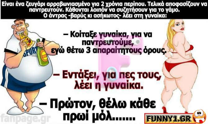 – Κοίταξε γυναίκα, για να παντρευτούμε, εγώ θέτω 3 απαραίτητους όρους.