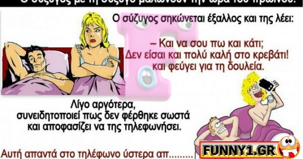 – Και να σου πω και κάτι; Δεν είσαι και πολύ καλή στο κρεβάτι! και φεύγει για τη δουλειά.