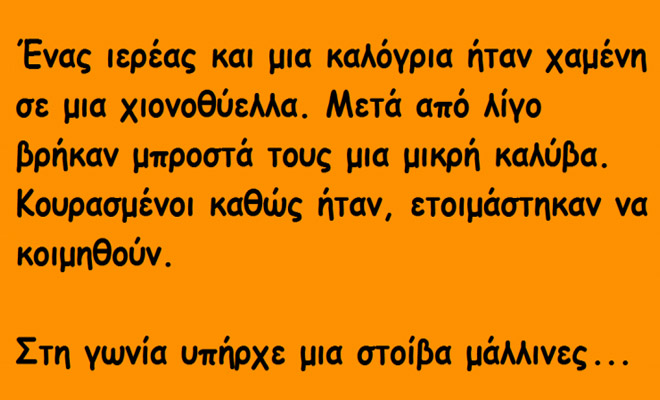 Ένας ιερέας και μια καλόγρια ήταν χαμένη σε μια χιονοθύελλα. Μετά από λίγο βρήκαν μπροστά τους μια μικρή καλύβα… Κουρασμένοι καθώς ήταν, ετοιμάστηκαν να κοιμηθούν.