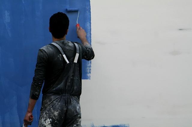 Ο ελαιοχρωματιστής βάφει το δωμάτιο, ενώ έχει αρχίσει να λερώνει το πάτωμα.