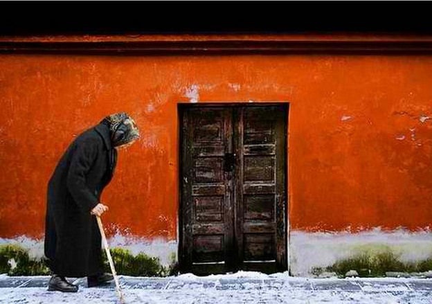 Μία γριά περπατάει στο πεζοδρόμιο σέρνοντας δύο σακουλές σκουπιδιών, μία σε κάθε χέρι.