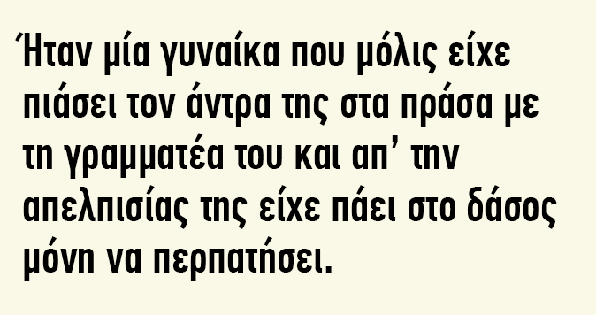 Ήταν μία γυναίκα που μόλις είχε πιάσει τον άντρα της στα πράσα με τη γραμματέα του και απ’ την απελπισίας της είχε πάει στο δάσος μόνη να περπατήσει.