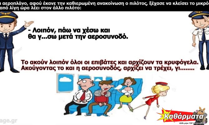 Σε ένα αεροπλάνο, αφού έκανε την καθιερωμένη ανακοίνωση ο πιλότος, ξέχασε να κλείσει το μικρόφωνο. Μετά από λίγη ώρα λέει στον άλλο πιλότο:
