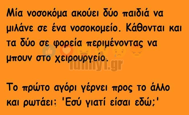 Μία νοσοκόμα ακούει δύο παιδιά να μιλάνε σε ένα νοσοκομείο. Κάθονται και τα δύο σε φορεία περιμένοντας να μπουν στο χειρουργείο. Το πρώτο αγόρι γέρνει προς το άλλο και ρωτάει: “Εσύ γιατί είσαι εδώ;”