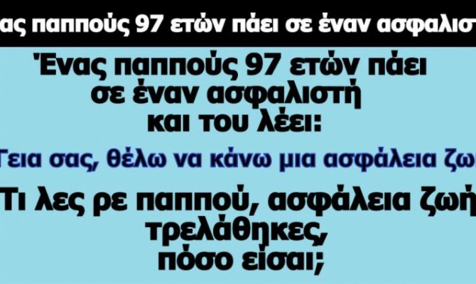 – Τι λες ρε παππού, ασφάλεια ζωής, τρελάθηκες, πόσο είσαι;