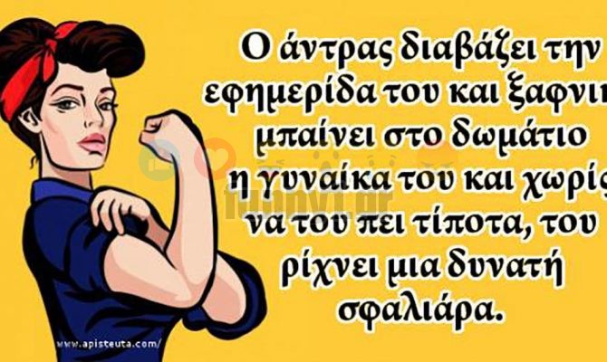 Ο άντρας διαβάζει την εφημερίδα του και ξαφνικά μπαίνει στο δωμάτιο η γυναίκα του και χωρίς να του πει τίποτα, του ρίχνει μια δυνατή σφαλιάρα.