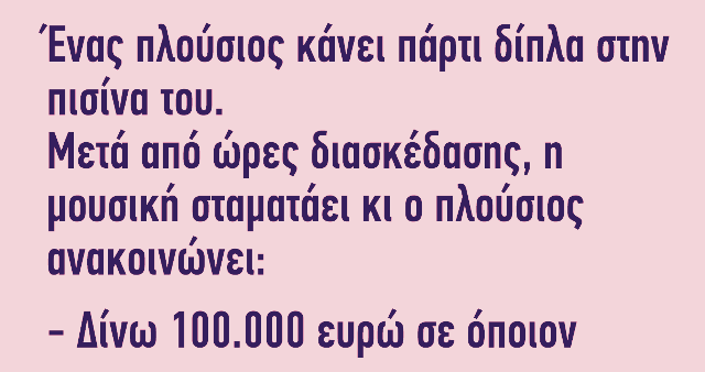 Ένας πλούσιος κάνει πάρτι δίπλα στην πισίνα του. Μετά από ώρες διασκέδασης, η μουσική σταματάει κι ο πλούσιος ανακοινώνει :