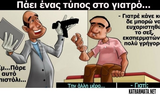 – Γιατρέ κάνε κάτι, δε μπορώ να ευχαριστηθώ το σeξ, εκσπεpματώνω πολύ γρήγορα.
