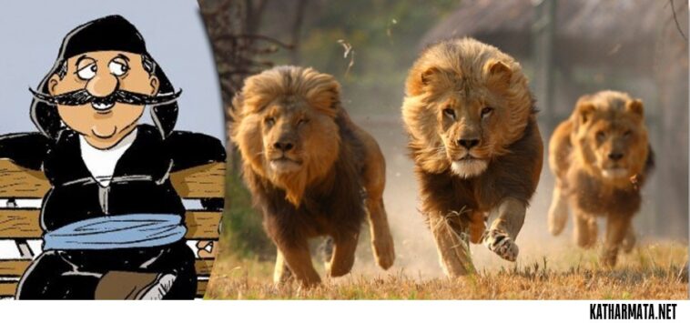 Ξαφνικά πετάγεται μπροστά τους ένα λιοντάρι και μένουν κόκαλο από την τρομάρα τους.