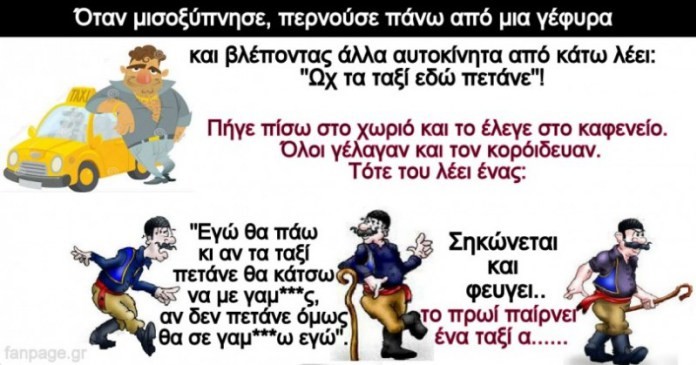 Όμως εκείνος επέμενε. Τότε του λέει ένας: «Εγώ θα πάω το Σάββατο στην Αθήνα σε μια κουμπαριά, κι αν τα ταξί πετάνε θα κάτσω να με γαμ *** ς, αν δεν πετάνε όμως θα σε γαμ *** ω εγώ “.