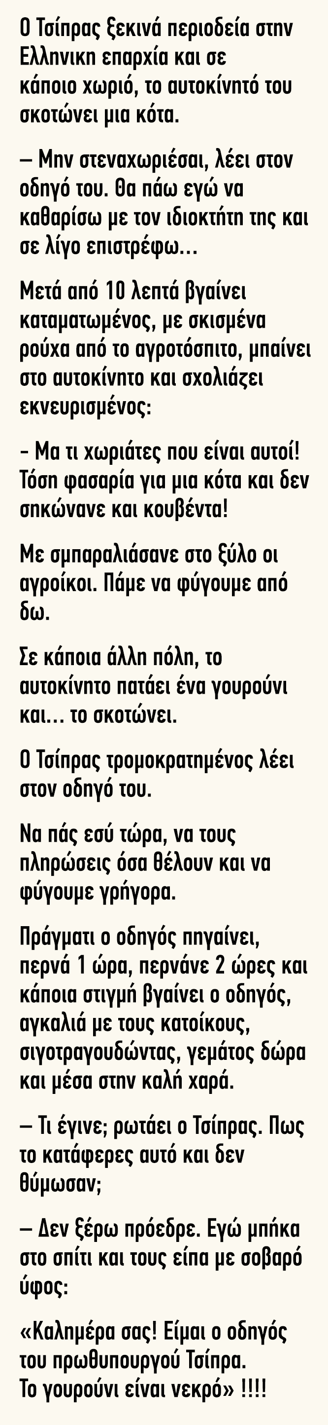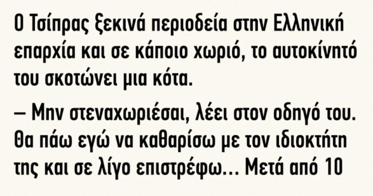 σε Ανέκδοτα WIN Ωραιο LOL Τελειο Ελεος Έξυπνο OMG WTF Κλαμα Ανέκδοτο: Ο Τσίπρας ξεκινά περιοδεία στην Ελληνική επαρχία 757χιλ. φορές διαβάστηκε. 574Κοινοποιήσεις WhatsApp Viber Facebook Messenger Κοινοποιήστε στο Facebook Δείτε περισσότερα Προηγούμενο ανέκδοτο Μπούφος άντρας σε ανεκδοτάρα με “άρρωστη” σύζυγο… Επόμενο ανέκδοτο Ανέκδοτο: Ένας άντρας ρωτά το γιατρό αν θα ζήσει μέχρι τα 100.