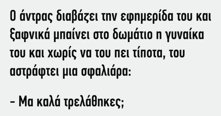 Ο άντρας διαβάζει την εφημερίδα του και ξαφνικά μπαίνει στο δωμάτιο η γυναίκα του και χωρίς να του πει τίποτα, του ρίχνει μια δυνατή σφαλιάρα.