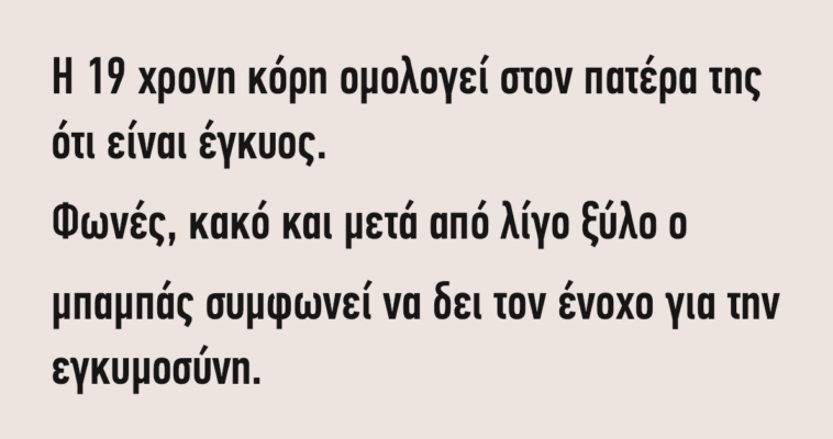 Η 19χρονη κόρη ομολογεί στον πατέρα της ότι είναι έγκυος. Φωνές, κακό ο πατέρας.Μετά από λίγο ξύλο, ο μπαμπάς συμφωνεί να δει τον ένοχο για την εγκυμοσύνη για να συζητήσουν την κατάσταση.