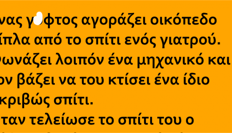 Ένας γύφτος αγοράζει οικόπεδο δίπλα στο σπίτι ενός γιατρού. Φωνάζει τον ίδιο μηχανικό και χτίζει ένα ολόιδιο σπίτι.
