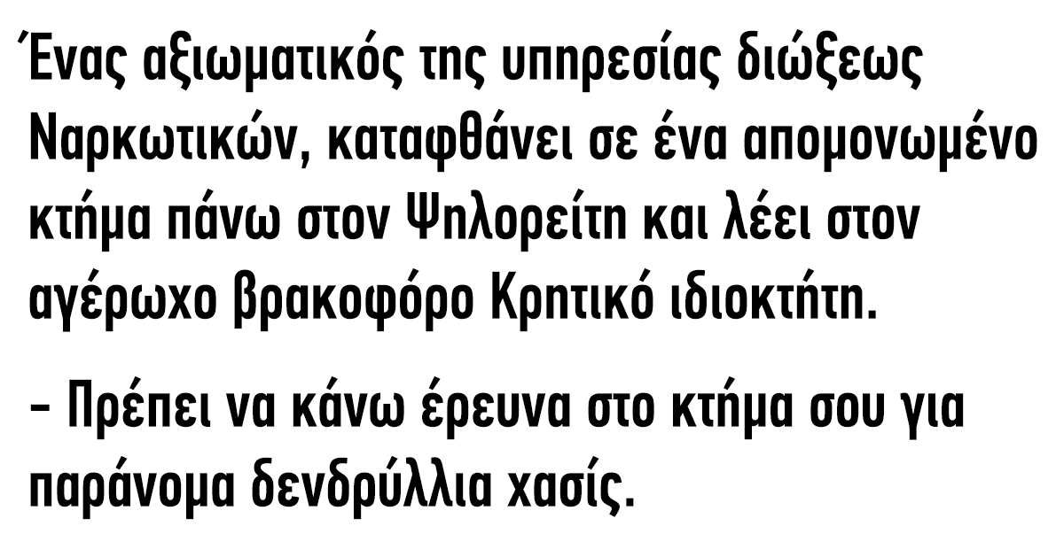 σε ΑνέκδοταΈνας αξιωματικός της διώξεως Ναρκωτικών καταφθάνει σε ένα κτήμα πάνω στον Ψηλορείτη