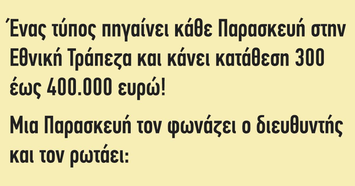 σε ΑνέκδοταΈνας τύπος πηγαίνει κάθε Παρασκευή στην Εθνική Τράπεζα…