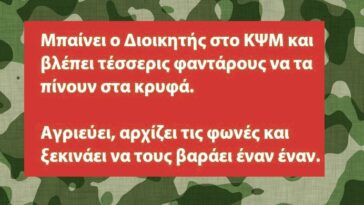 σε ΑνέκδοταΜπαίνει ο Διοικητής στο ΚΨΜ και βλέπει τέσσερις φαντάρους