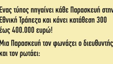 σε ΑνέκδοταΈνας τύπος πηγαίνει κάθε Παρασκευή στην Εθνική Τράπεζα…